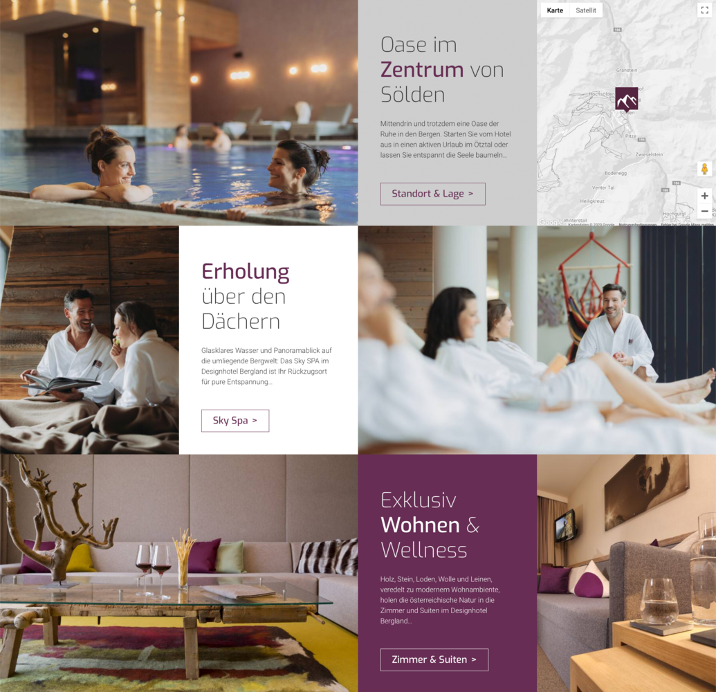 Als Designhotel haben die Betreiber des Bergland Sölden besondere Ansprüche in Sachen Optik. Auch beim Design der Website lag deshalb das Augenmerk darauf, einen außergewöhnlichen Ersteindruck zu hinterlassen. Der Magazin-Charakter spiegelt die vielen Elemente des Hauses wider und sorgt so für einen individuellen Auftritt, der sich von gewöhnlichen Hotel-Websites abhebt und nach aktuellen Bedürfnissen befüllen lässt.