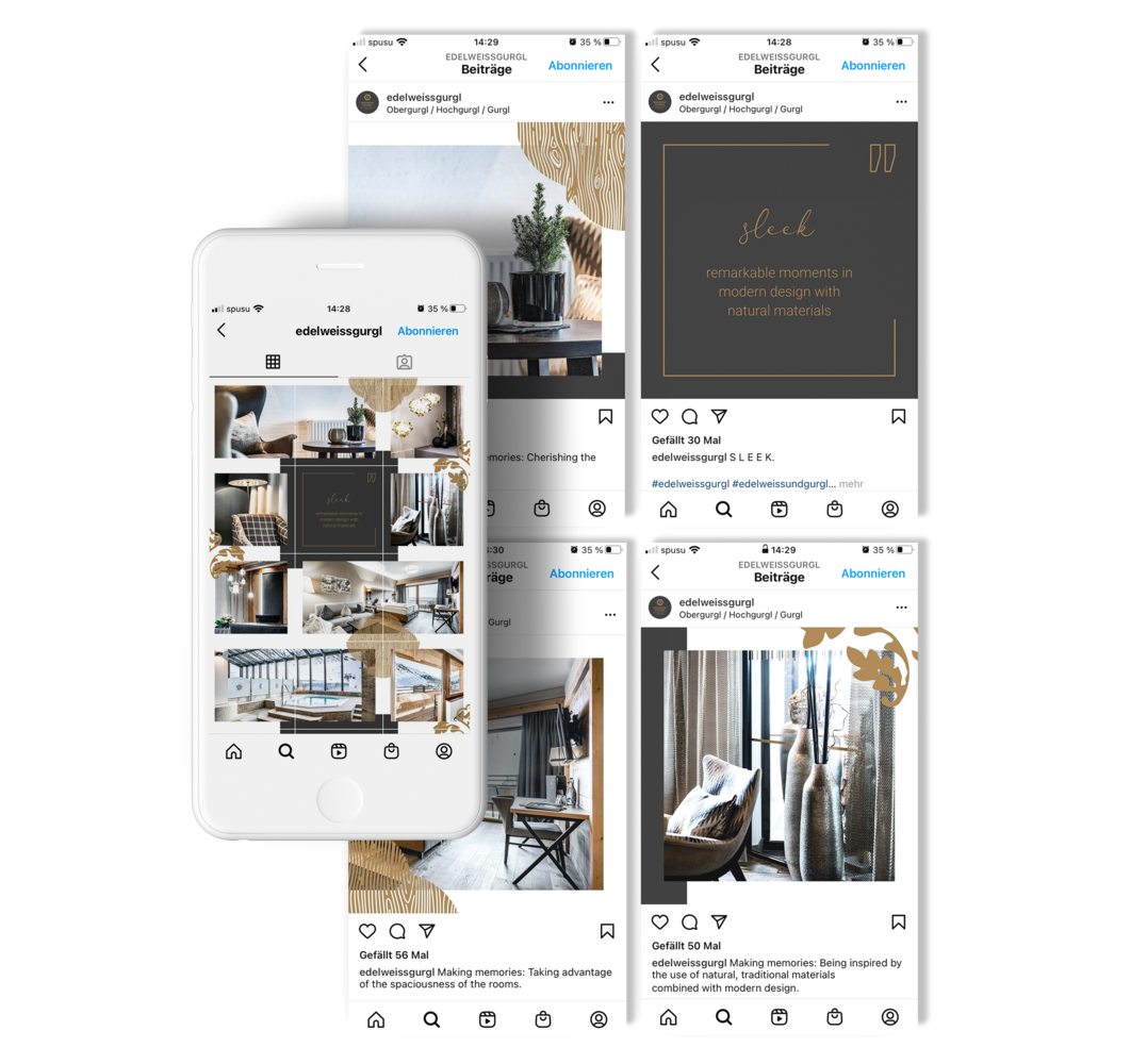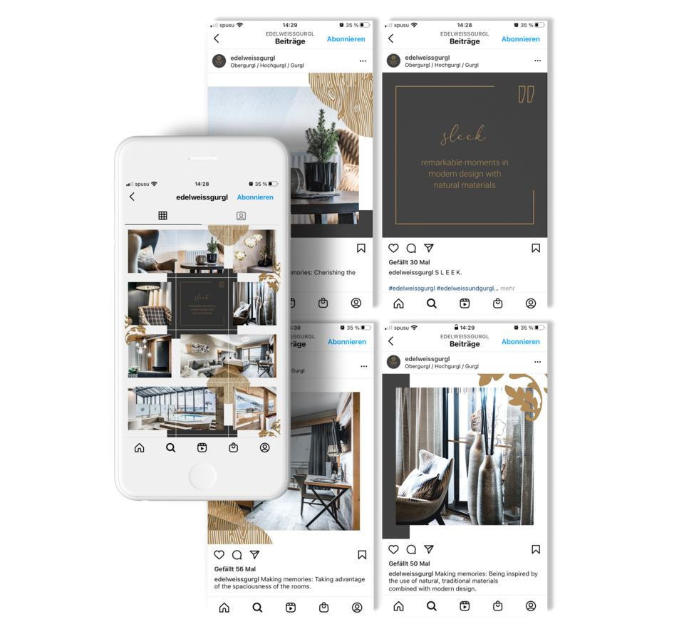Via Social Ads auf Facebook und Instagram wurde das Feeling der "edlen Momente" mit Videoclips und Bildern bei der Zielgruppe platziert und die neue Marke des Edelseiss & Gurgl in Umlauf gebracht.