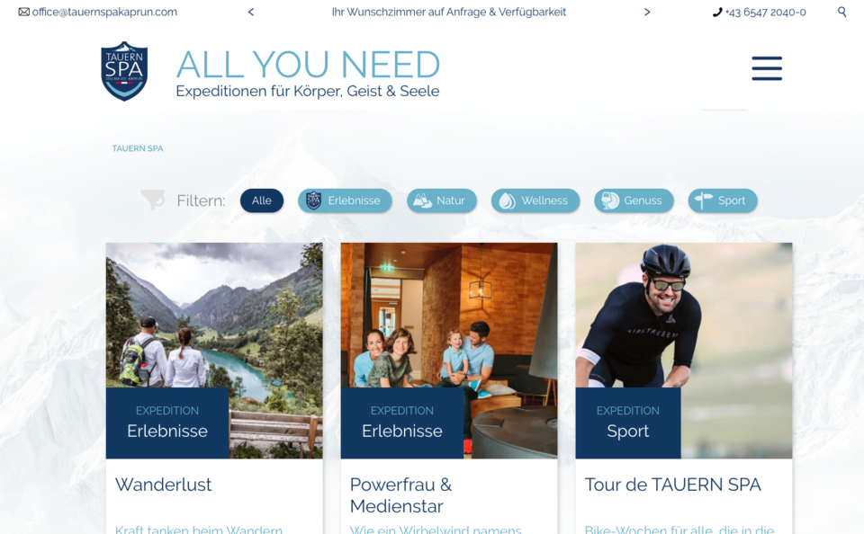 Das Tauern SPA ist eine der führenden Thermen in Österreich und ein Refugium für Ruhesuchende, eingebettet im Panorama der Salzburger Bergwelt. Das Angebot in Kaprun umfasst neben der 20.000 m² großen Wasser- & Saunawelt ein modernes 4*S Hotelresort mit einem großzügigen SPA und einer umfassenden Auswahl an Sportmöglichkeiten und Ausflugszielen, die unter dem Thema Expeditionen zusammengefasst und aktiv kommuniziert werden. Gäste kommen aus ganz Europa und buchen ihren Aufenthalt häufig im Voraus über die Webseite.